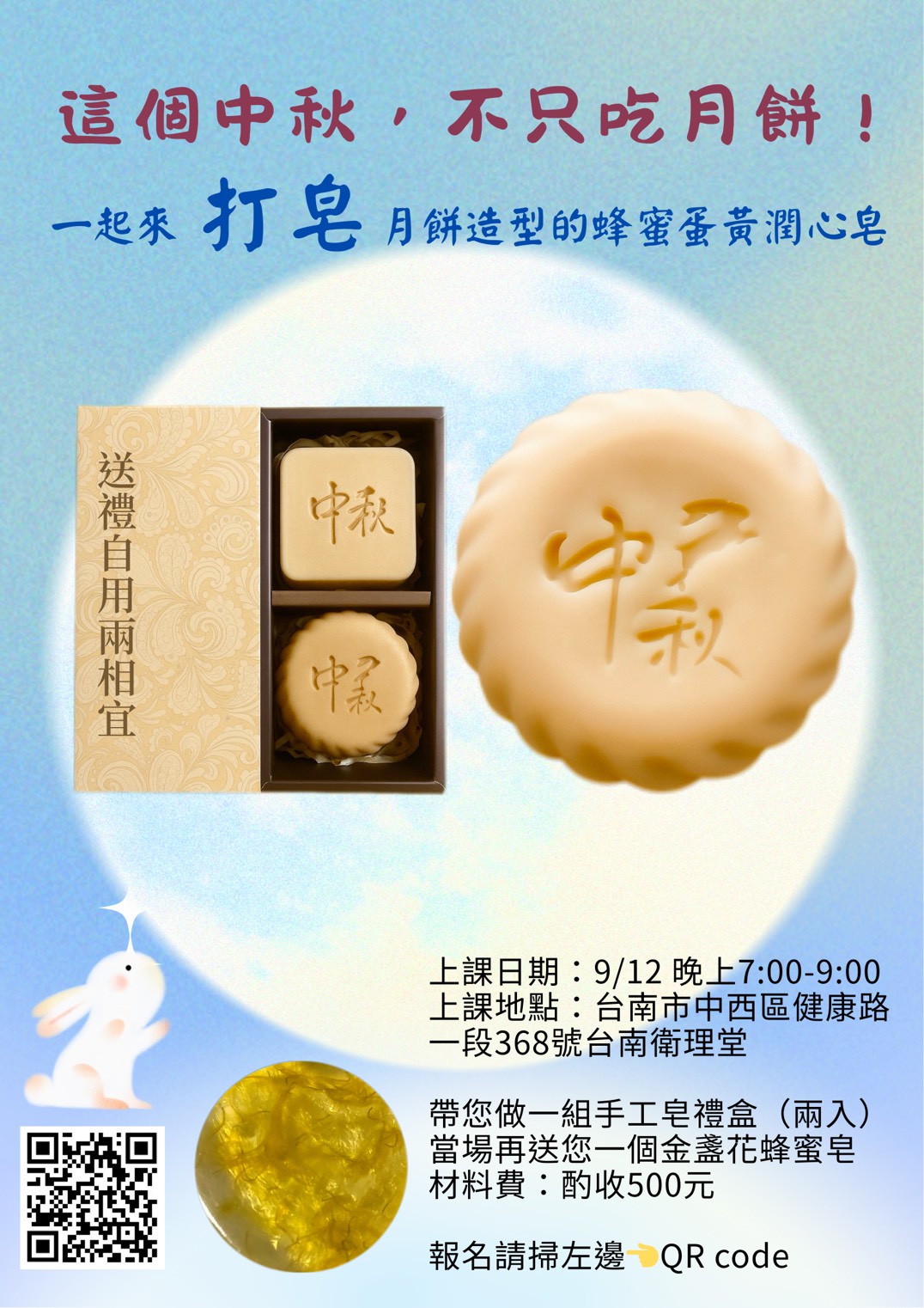 🥮月餅造型手工皂🛀 中秋月圓人團圓,這次不只吃月餅,還要打皂! ✔ 天然蜂蜜 + 雞蛋黃 = 滋潤沁心 ✔ 自己親手做 一次帶回兩顆+精美禮盒🎁 ✔ 現場再送金盞花蜂蜜皂🌕 ![]() |