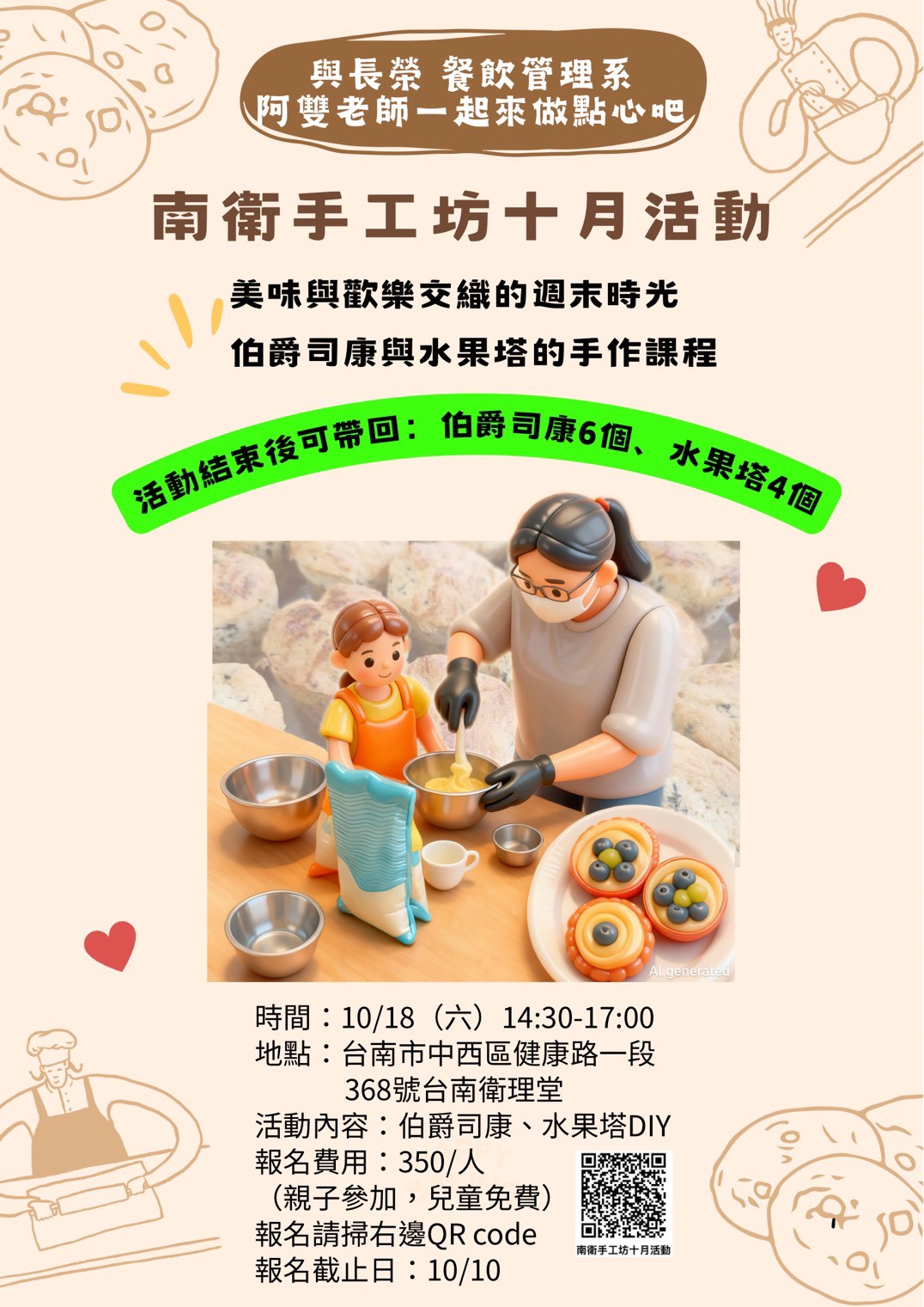 🍽️伯爵司康與水果塔DIY😍 美味與歡樂交織的週末時光🧉由阿雙老師(餐飲管理系)帶領的超chill下午茶課程~ 🥧歡迎參加!也歡迎帶孩子來個親子time! 🌤️費用:350元/人,可帶回伯爵司康6個+水果塔4個 名額有限,立刻按此報名 ![]() |
